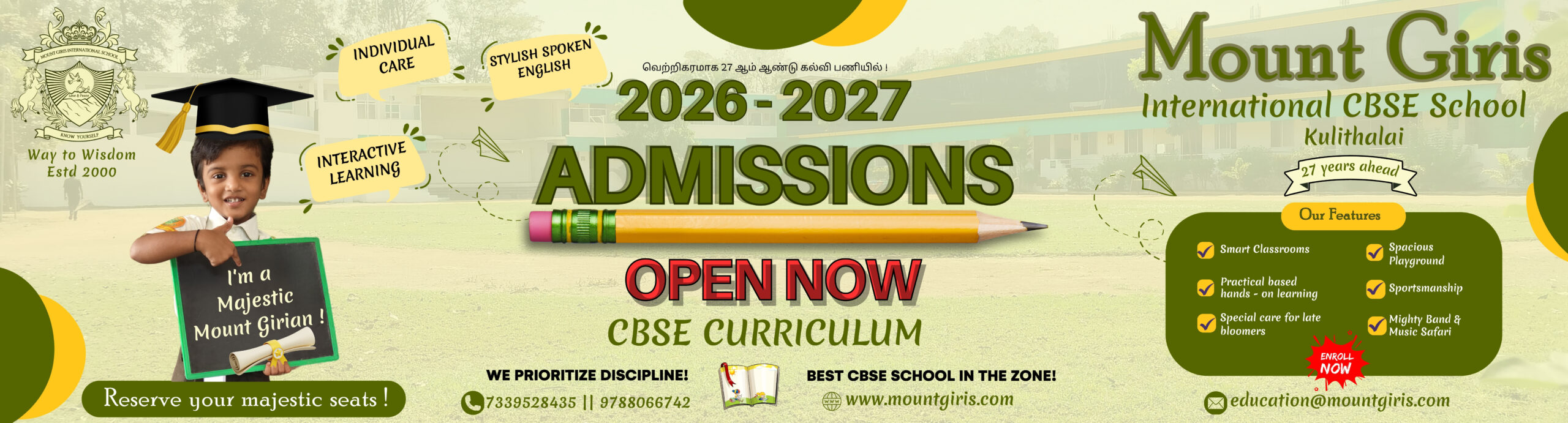 Mount Giris International School has the biggest campus in Kulithalai, as well as commute facilities in and around neighborhoods. Come visit our campus.